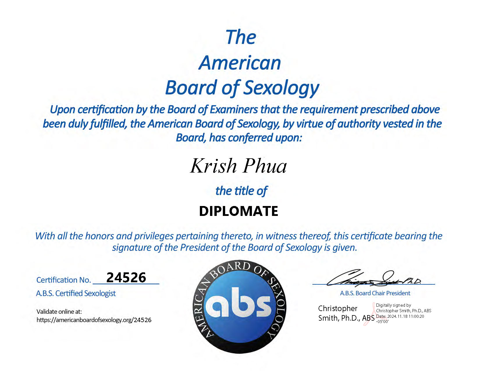 - Board Certified Diplomate (by default a Certified Sexologist) by the American Board of Sexology, Nov 2024