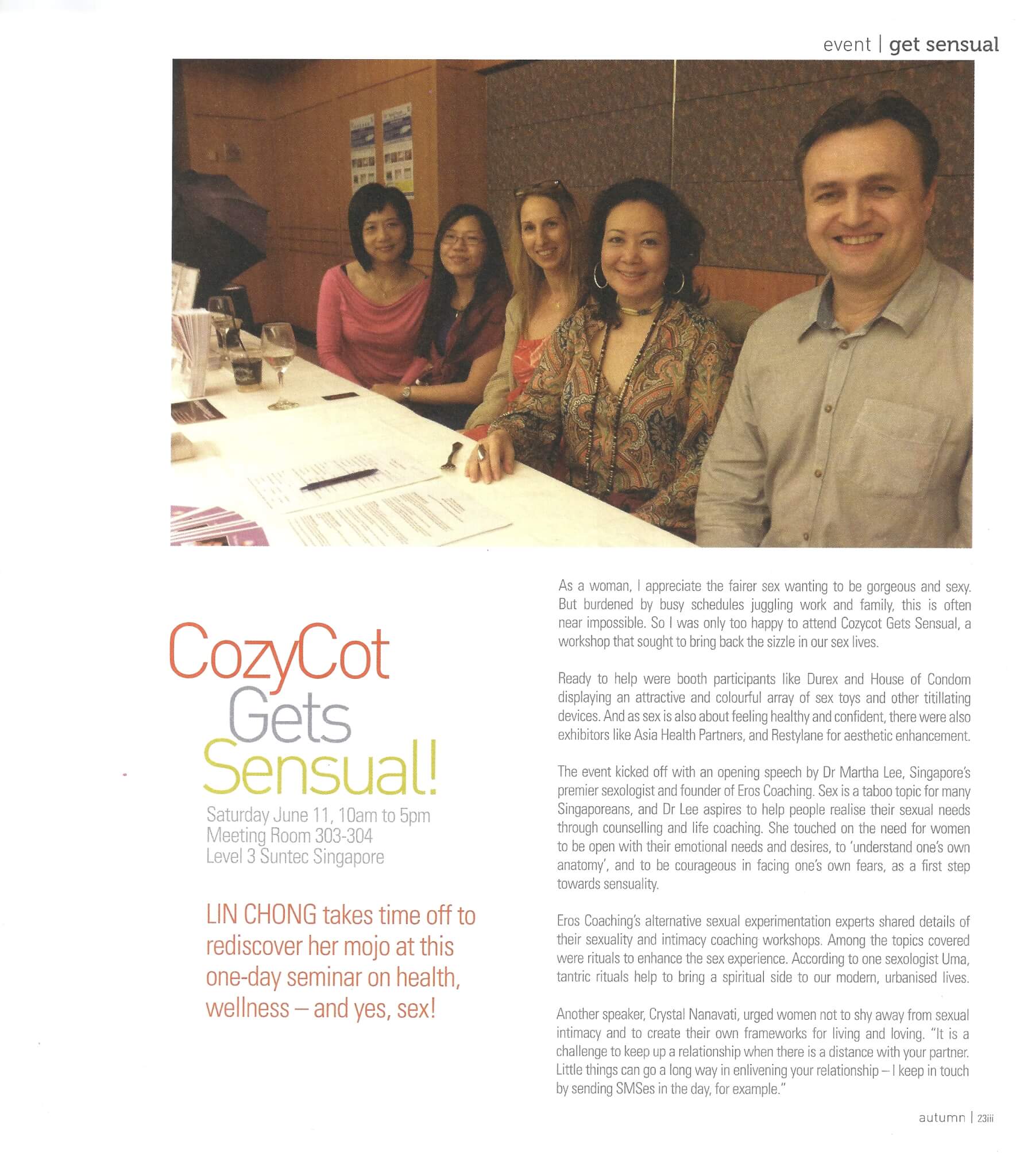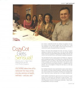 CozyCot Gets Sensual Posted On: May 1, 2012 I spoke at the event CozyCot Gets Sensual on female sexuality on 11 June 2011. This event was featured in CozyCot’s magazine (Oct – Dec 2011). Related posts: CozyCot: Top 100 Inspiring Women My Speech at CozyCot International Women’s Day 2011 Milestones of 2011 Featured Sex Educator in Good Vibrations Magazine
