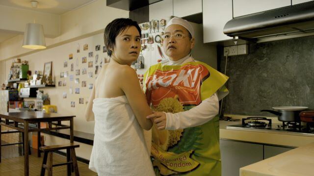 Story 3: Journalist Bao Ling (Yeo Yann Yann), 40, who’s been man-less for the past six years, comes home and imagines a human Durian Condom (Lee Chau Min) in her flat; begging to be used, as its expiry date is due, the condom urges her to get laid quickly. Bao Ling contacts a “plumber” called Thor (Julian Hee) and waits in readiness.