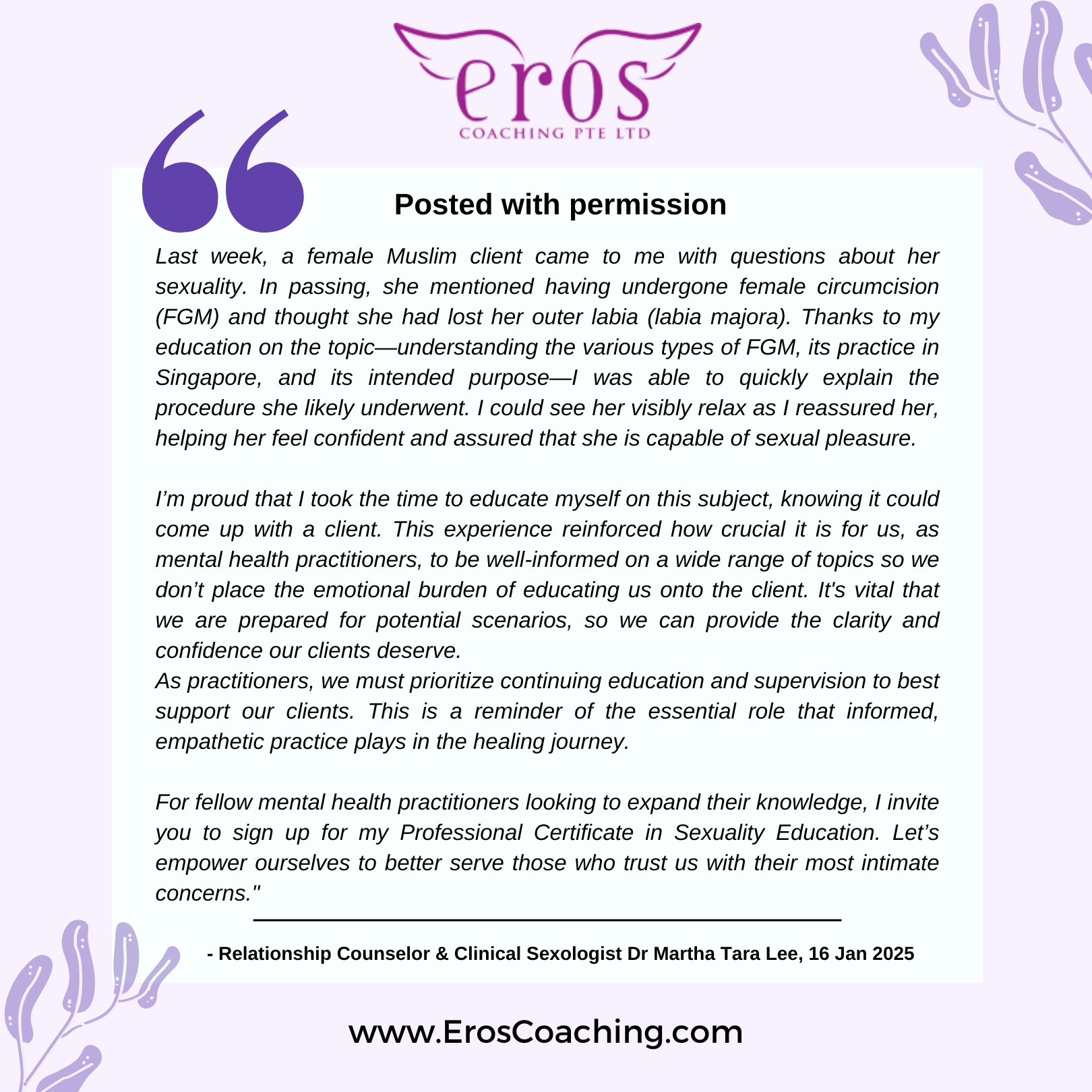 Dr. Martha Tara Lee has been a passionate advocate for positive sexuality since 2007. With a Doctorate in Human Sexuality and a Masters in Counseling, she launched Eros Coaching in 2009 to help individuals and couples lead self-actualised and pleasurable lives. Her expertise includes working with couples who have unconsummated marriage, individuals with sexual inhibitions and discrepancies in sexual desire, men with erection and ejaculation concerns, and members of the LGBTQIA+ and kink communities. Dr. Lee welcomes all sexual orientations and is available for online and face-to-face consultations. Martha speaks English and Mandarin.