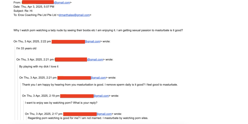 While I’ve been in the hospital since 3 April 2025, I received a flood of unsolicited, sexually explicit emails from a stranger. I have never contacted him. I never gave consent. He sent graphic messages, two face photos, and his WhatsApp number—despite me never replying.