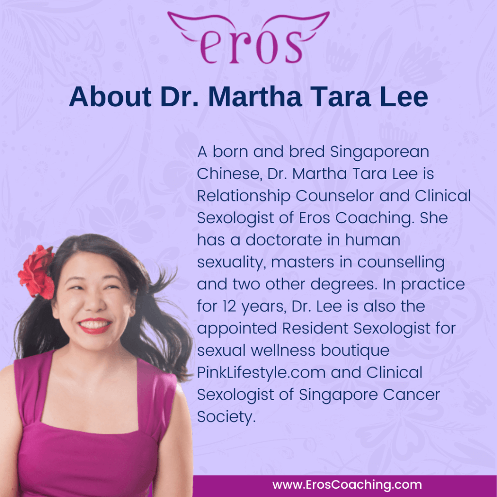 Surrounded by friends who were sexually inhibited and struck by dire lack of positive conversations around sex and sexuality in Singapore, Dr. Martha Tara Lee set out to make a positive difference in embarking on her doctorate in human sexuality before launching Eros Coaching in 2009. Today, she remains dedicated to working with individuals and couples who wish to lead self-actualised and pleasure-filled lives.