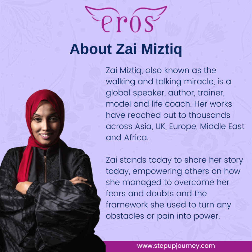 Zai Miztiq, also known as the walking and talking miracle, is a global speaker, author, trainer, model and life coach. Her works have reached out to thousands across Asia, UK, Europe, Middle East and Africa.