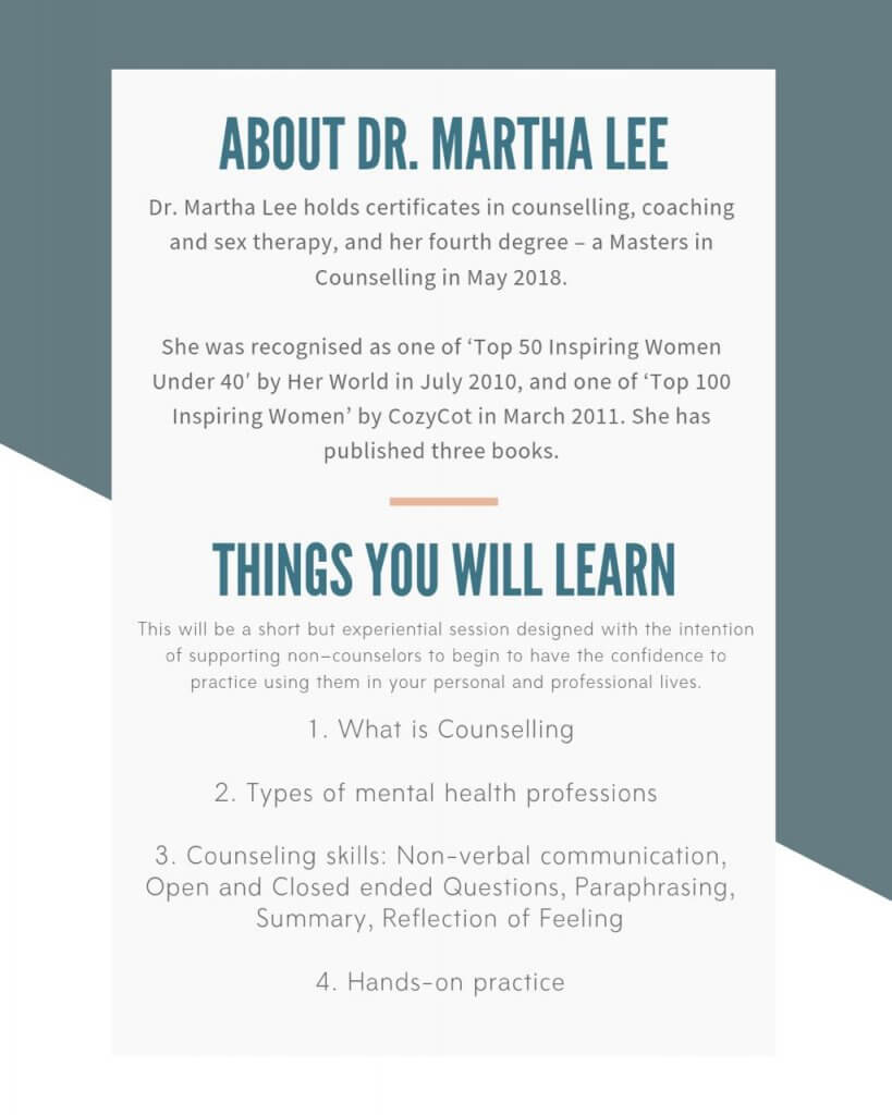 She also holds certificates in counselling, coaching and sex therapy, and her fourth degree – a Masters in Counselling in May 2018. In practice for more than 10 years, she is the only certified sexuality educator and certified sexuality educator supervisor by the American Association of Sexuality Educators, Counselors and Therapists (AASECT) in Singapore.