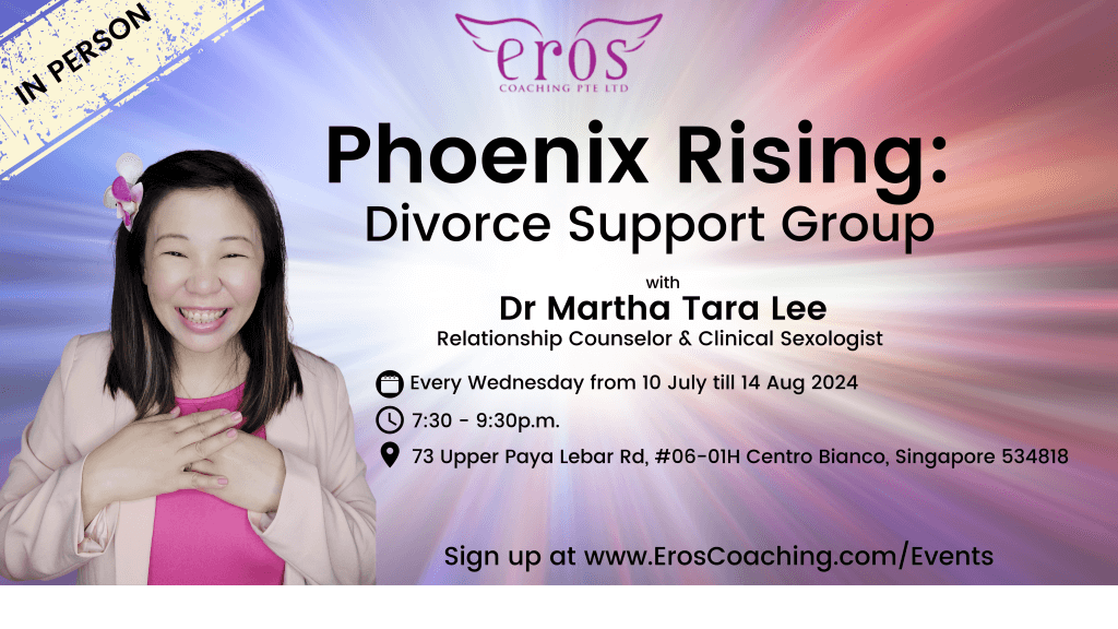 Join our intimate and supportive group for individuals who have been divorced for 2 years or more. Led by Relationship Counselor and Clinical Sexologist Dr Martha Tara Lee, this 6-week program offers a safe space for healing, growth, and connection. Explore your journey post-divorce, gain insights, and build resilience in a welcoming environment.